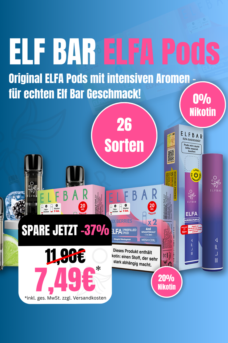 👉 Stöbere durch unsere Kategorien oder beginne direkt mit unseren ELFA Pods, Elfbar 600, Elf Bar 800 oder ELFA Refill Pods und den passenden Liquids dazu.